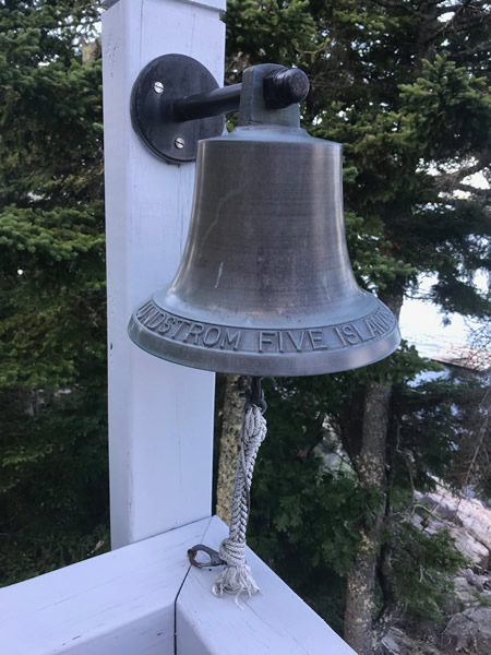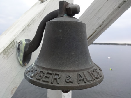 The above bell had an oxidized patina applied when we made it. The letters tops were left unpolished. She has lived outside on a dock by the salt water for many years. Every few years a polishing with fine grade bronze wool can remove normal environmental debris from the surface. |